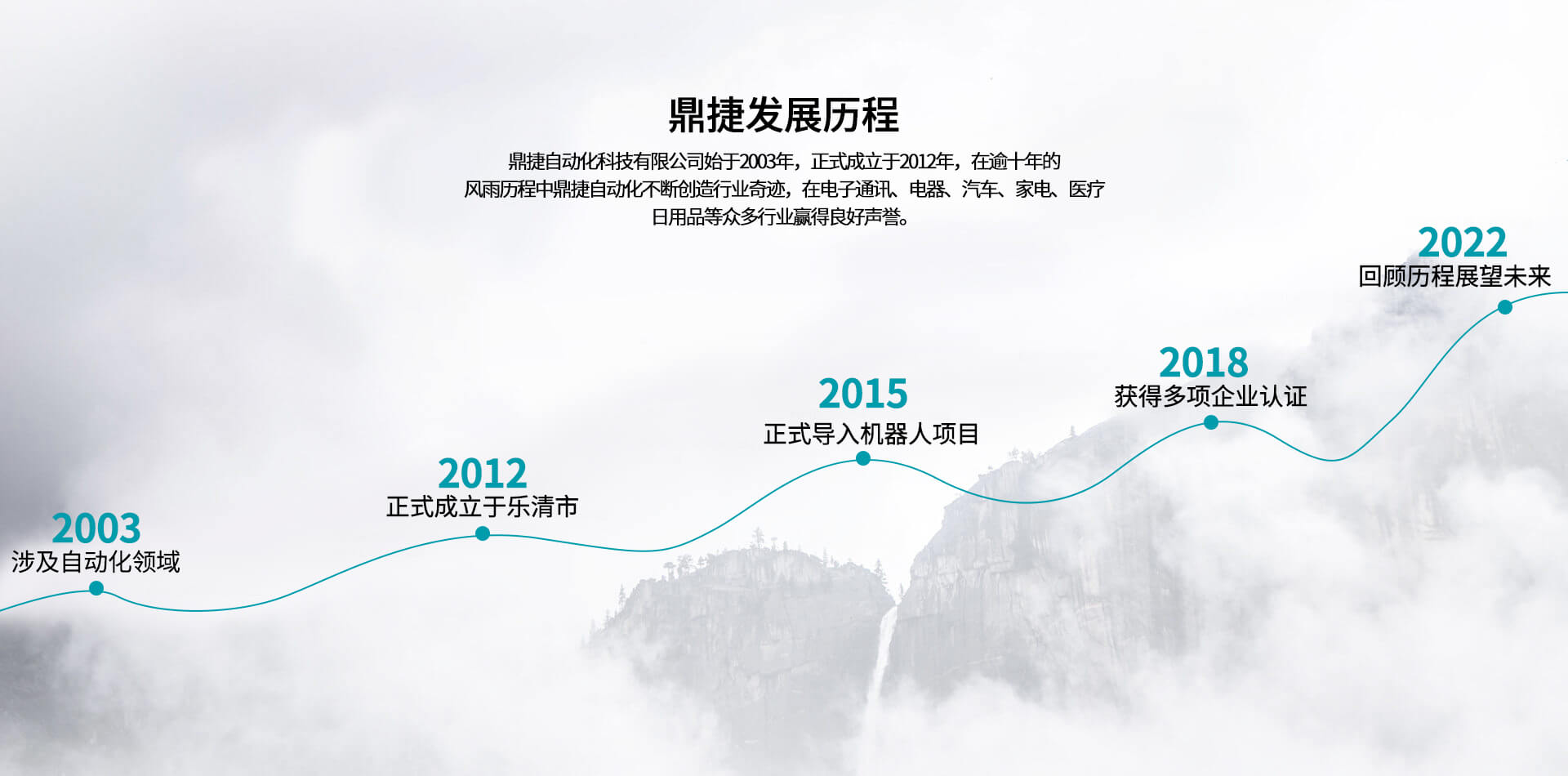 公司始于2012年,在逾十年的風雨歷程中,不斷創(chuàng)造行業(yè)奇跡,在電子通訊、電器、汽車、家電、醫(yī)療、日用品等眾多行業(yè)贏得良好聲譽。公司坐落于浙江省樂清經(jīng)濟開發(fā)區(qū),現(xiàn)有人員63人,擁有經(jīng)驗豐富的工程技術(shù)研發(fā)團隊11人,其中高級工程6人,具備本科以上學歷高級工程人員比例78%;同時鼎捷自動化在蘇州,東莞等地設(shè)立分公司以服務(wù)目標市場客戶,目前鼎捷自動化已經(jīng)為下客戶提供配套自動化解決方案:泰科、安費諾、莫士、華為、中興、普聯(lián)、智英、意華、德豐、公牛、萬事達、華豐、飛雕、普思、冠聯(lián)、俊朗松田、進聯(lián)、高正、盛凌等。鼎捷自動化專業(yè)從事連接器、開關(guān)及相關(guān)電子、電器、五金、塑膠產(chǎn)品組裝自動化定制、設(shè)計、制造、銷售。2012年,鼎捷自動化正式導(dǎo)入機器人應(yīng)用項目,可為各類客戶提供電子、電器、汽車、五金、塑膠等集成自動化智能組裝系統(tǒng)。